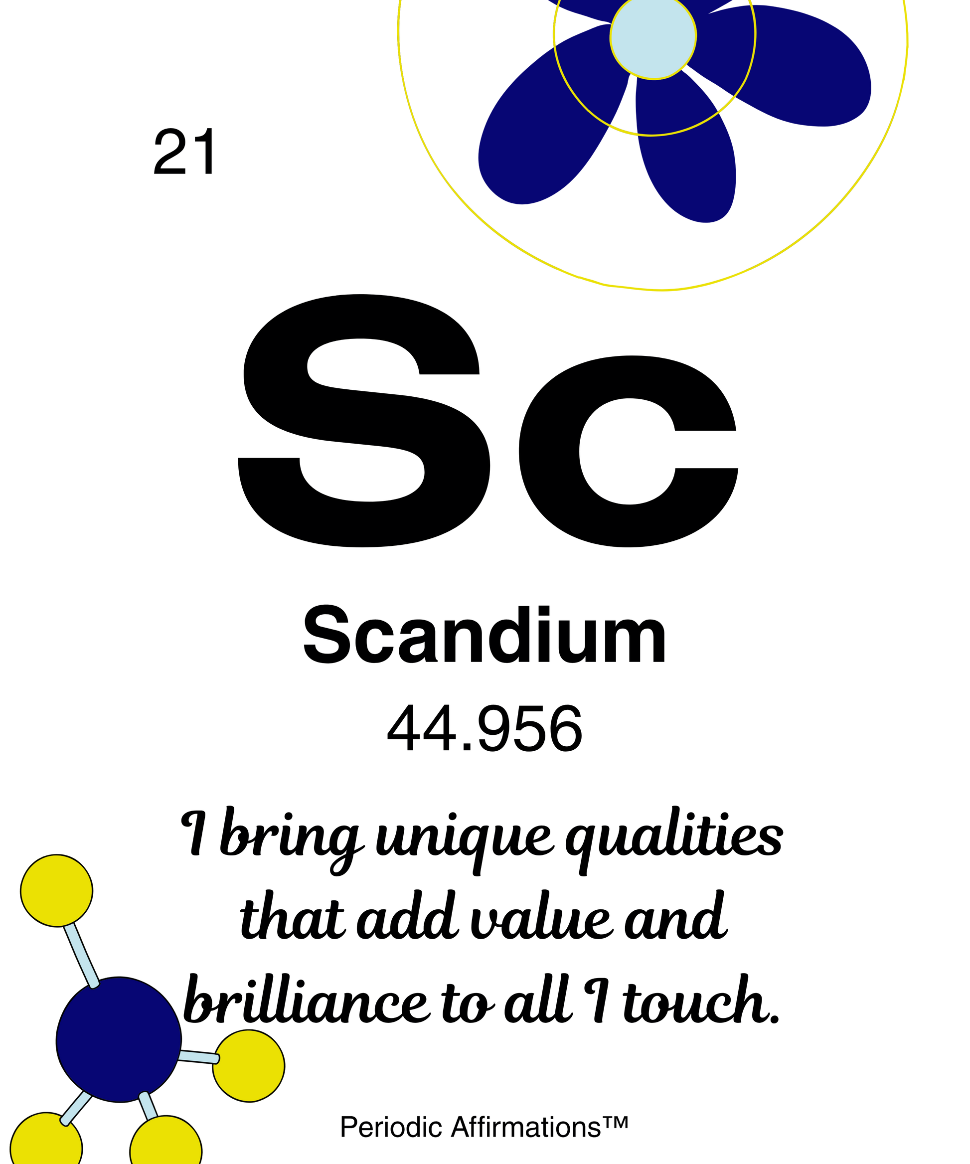 - 21-Scandium (Sc): I bring unique qualities that add value and brilliance to all I touch.
