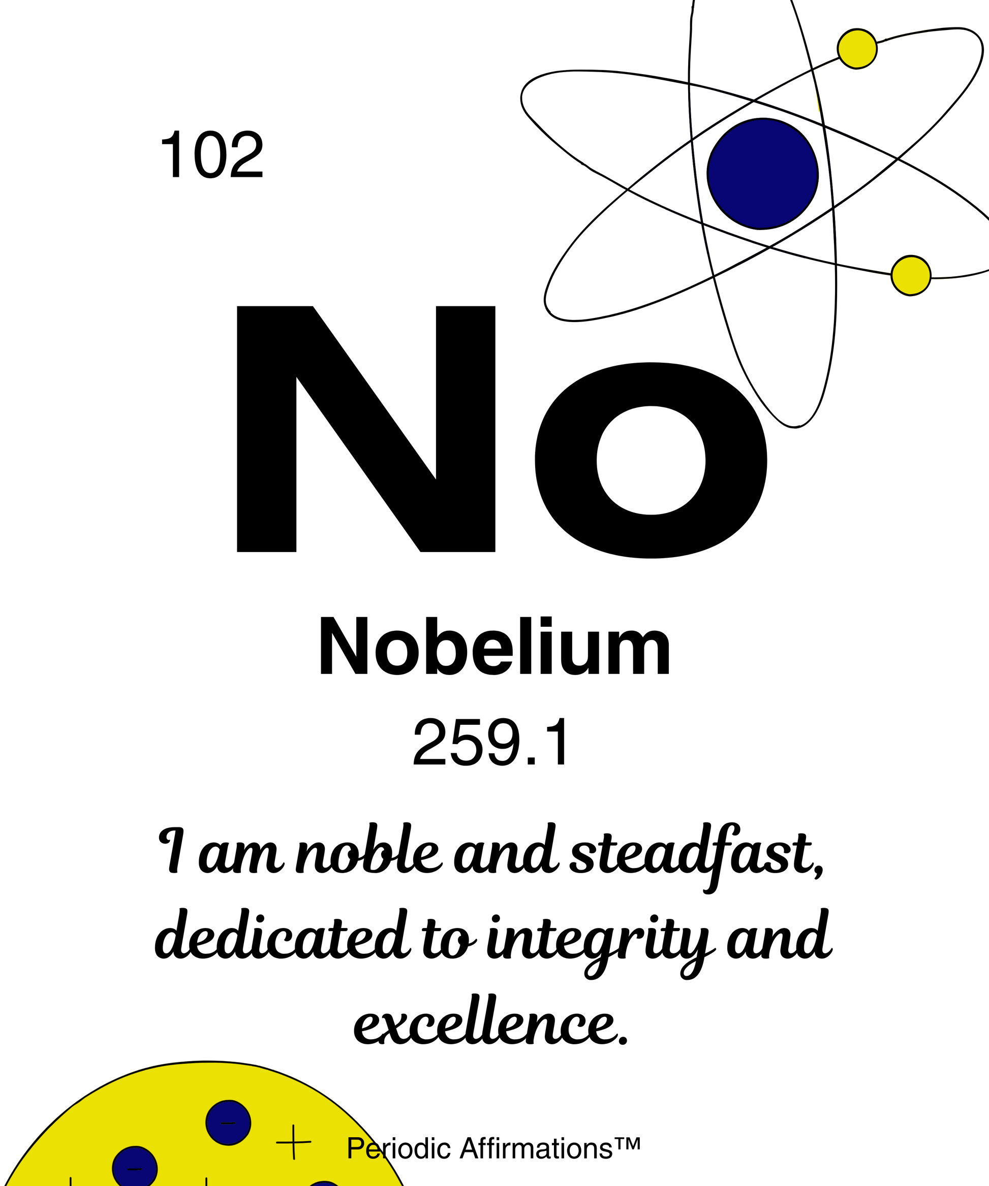 102-Nobelium (No): I am noble and steadfast, dedicated to integrity and excellence.